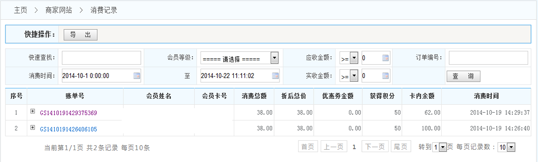 1.導(dǎo)出:將按條件查詢到的消費(fèi)賬單數(shù)據(jù) 導(dǎo)出成Excel表格
