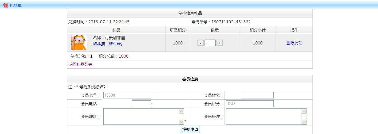 流程: 查詢禮品----->點(diǎn)擊兌換(加入購(gòu)物車)----->審核購(gòu)物車(提交申請(qǐng))----->等待審核