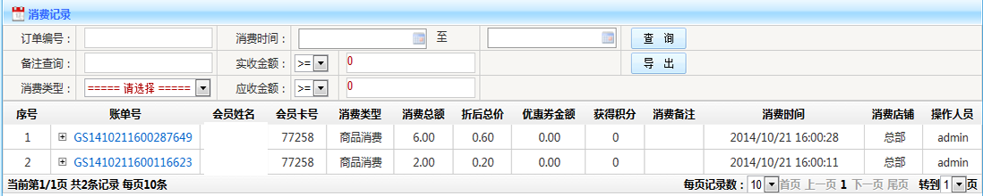 消費記錄: 1.查詢:可以根據(jù)消費單號 時間段 消費類型等條件查詢 2.導(dǎo)出:可以將按條件查詢出來的數(shù)據(jù),以Excel表格形式導(dǎo)出 3.列表:雙擊訂單號,如果有消費詳情的可以查看消費詳情